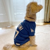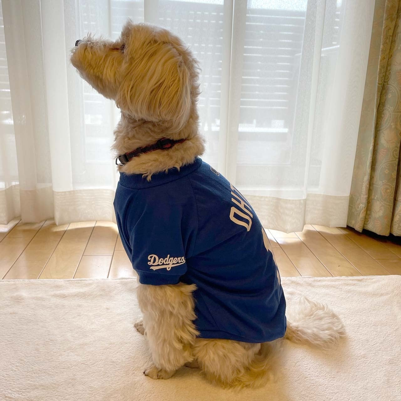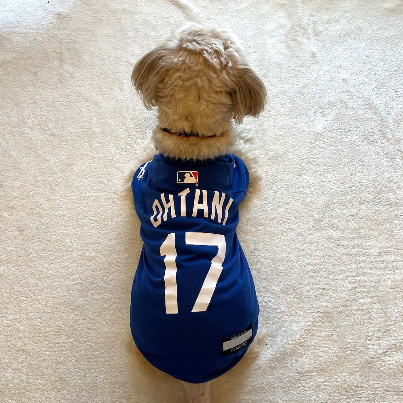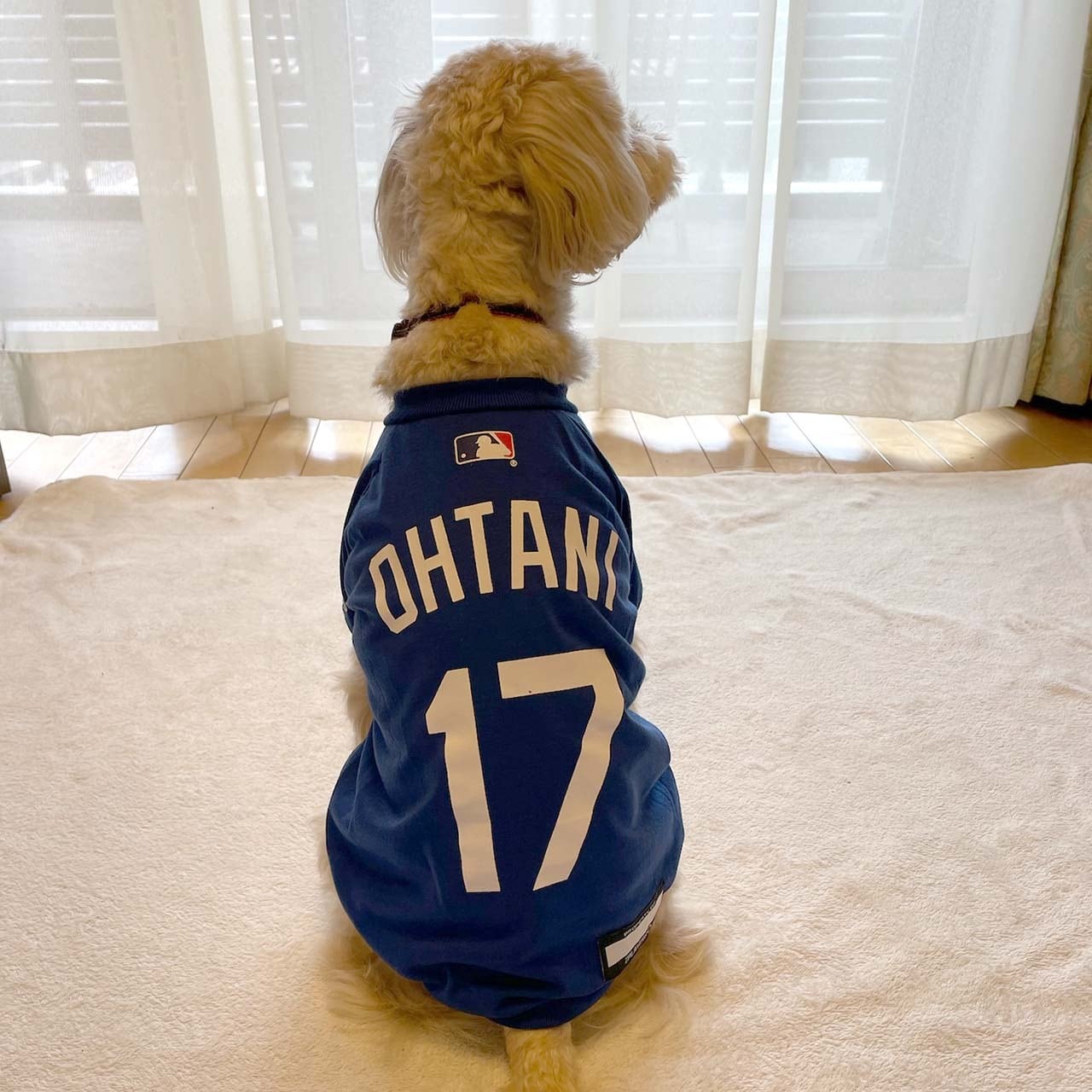 背中に大谷選手の名前「OHTANI」と背番号「17」がプリントされています。袖にはドジャースロゴとLAマーク入りです。愛犬とのお揃いコーデや、野球観戦時に着用するのにぴったりなアイテムです。